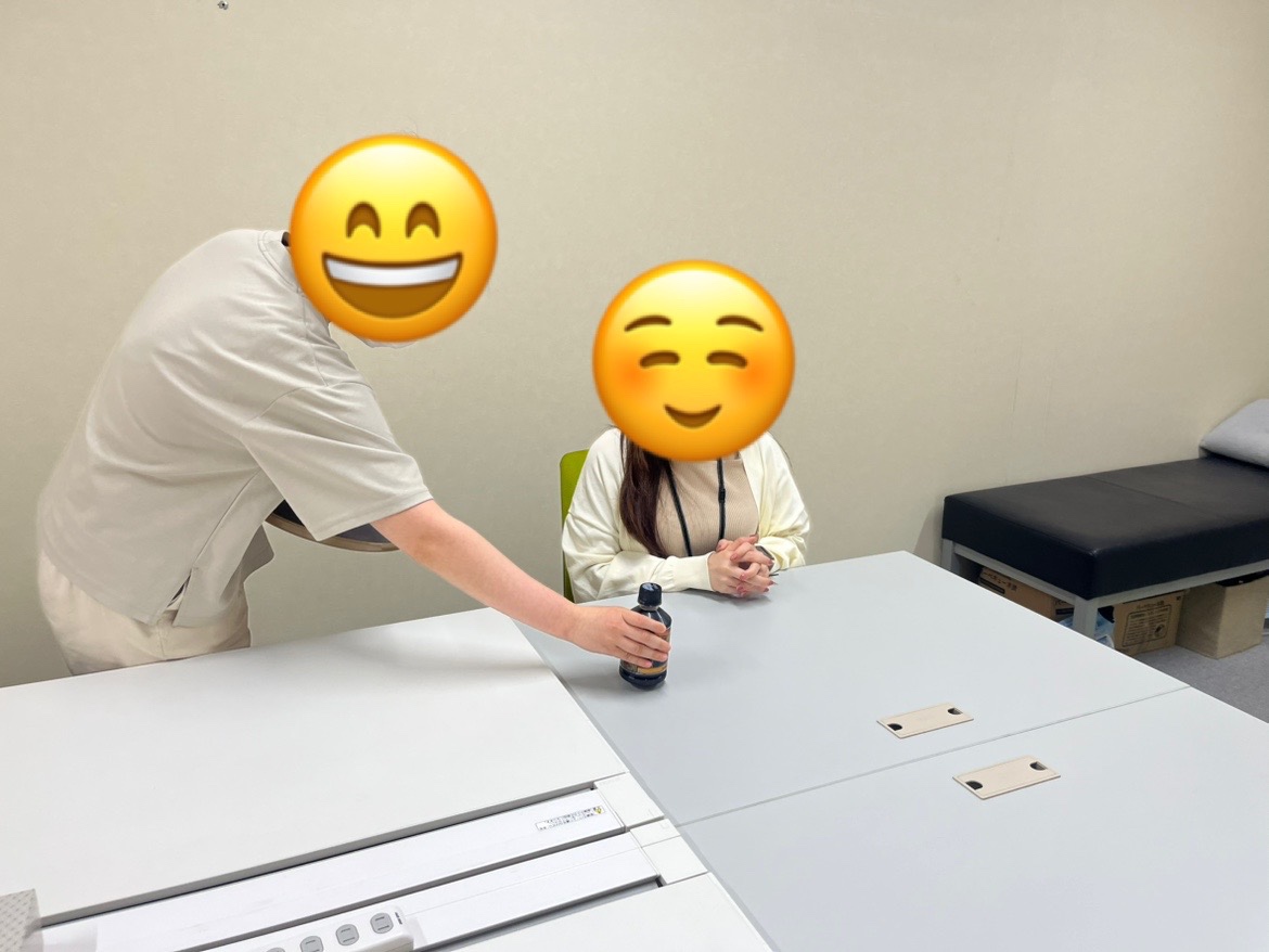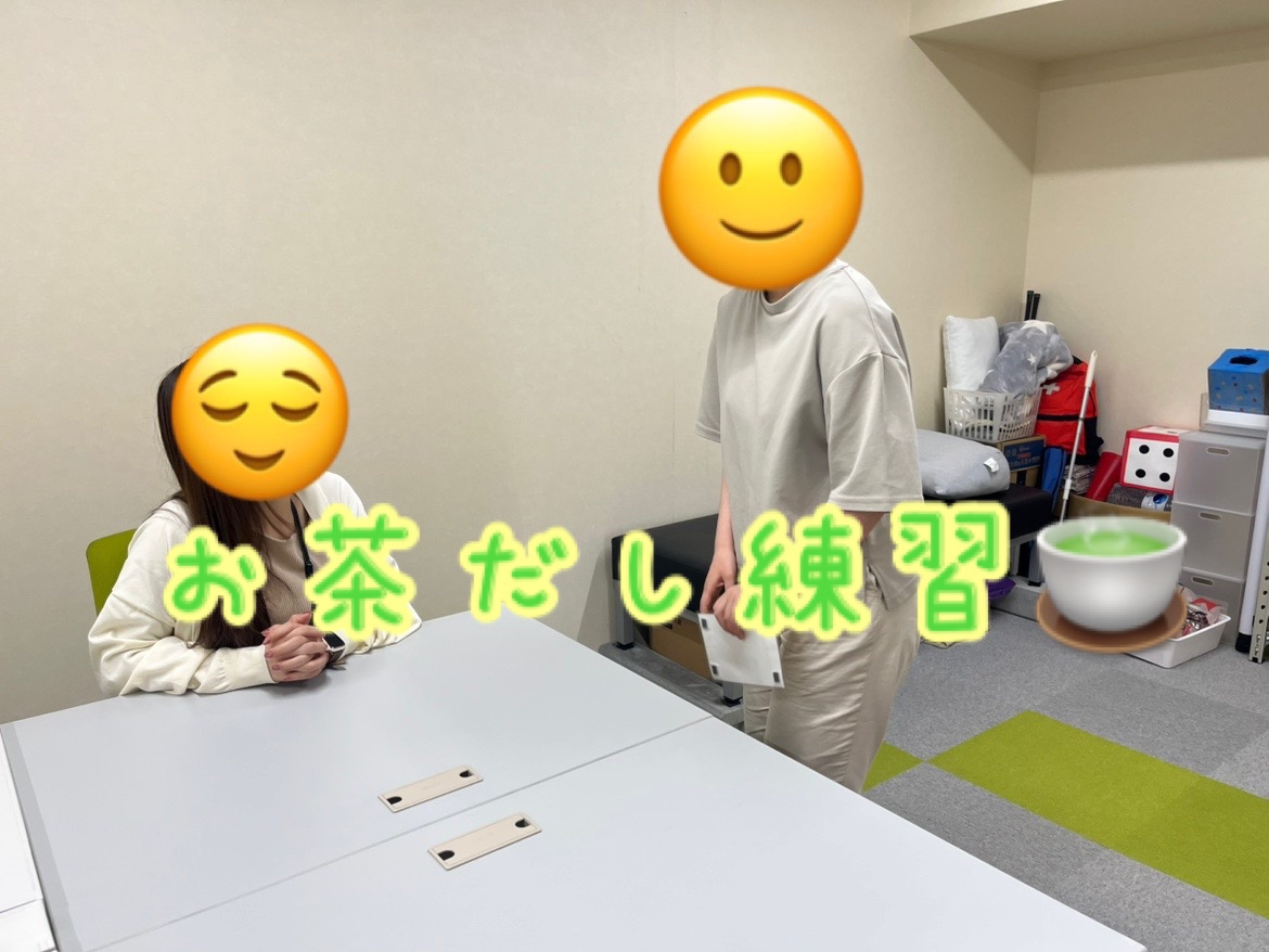 「お茶出し」の役割は、事業所に実際のお客様がいらっしゃったときに、飲み物をお出しする役割です!きれいなお辞儀、物の置き方などの所作や言葉遣いなどが練習でき、接客の仕事に興味がある方や、人前で話したりハキハキ話したりする練習をしたい方などが挑戦しています😊