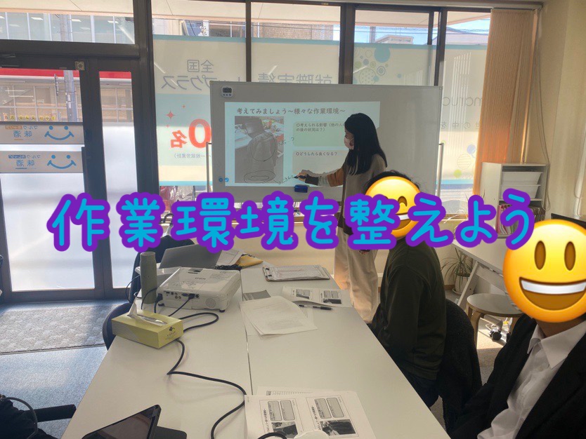 「作業環境を整える」をテーマに、仕事をする際の机の上の整え方、仕事場での共有スペースの使い方の注意点などを学びました♪