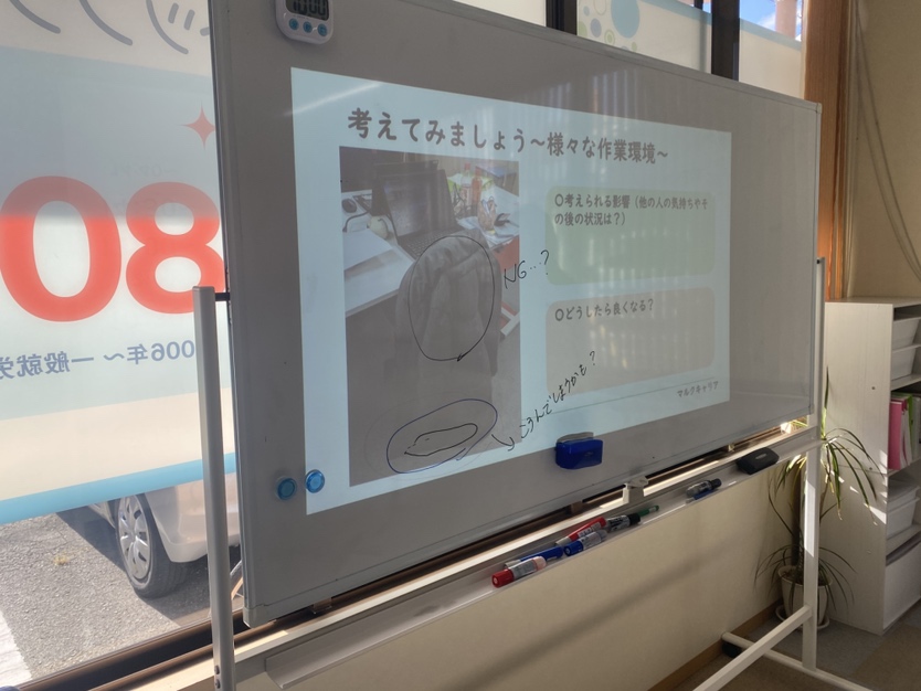 職場=共有スペースになるので、どんなことを気を付けたらいいか…ということについて、実際に写真を見ながらみんなで考えました。