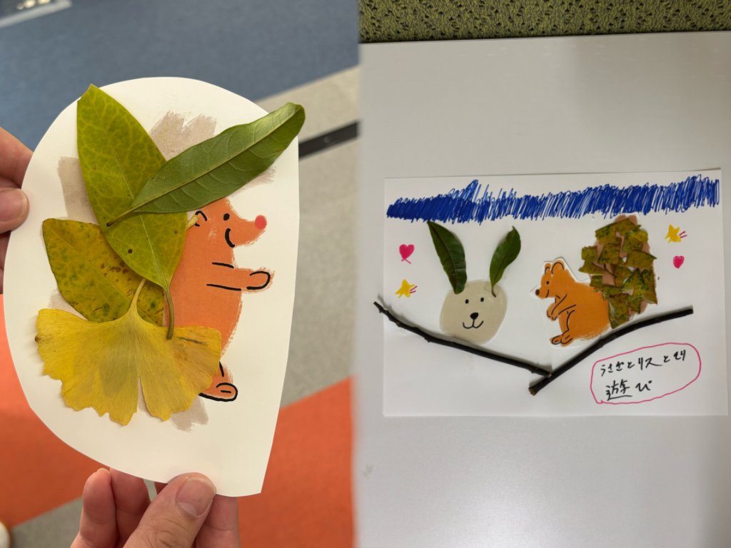 近くの神社に落ち葉を拾いに行き、拾った落ち葉を使っていろいろな動物を作りました!